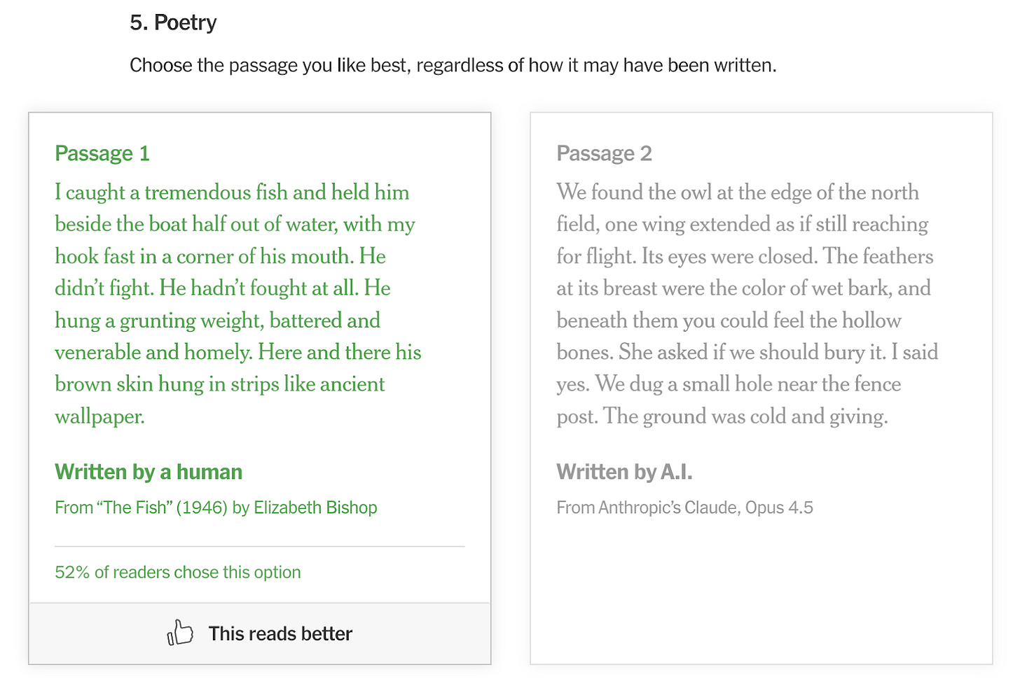 She had posted a screenshot of one of the questions, asking readers to choose the passage they like best, between the opening of Elizabeth Bishop’s “The Fish,” one of the great 20th-century poet’s more famous poems, and some bad poem, if you can call it that, by Anthropic’s Claude, Opus 4.5. She had, of course, answered correctly (it should be clear that by this I mean she chose Bishop), noting in the caption how obvious it was; besides the masterful construction and stunning emotional arc of the poem, Elizabeth Bishop is one of the most anthologized poets of her generation, and if you know her, you probably know “The Fish.”